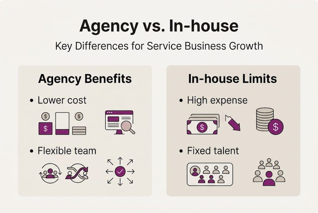 That said, the right model depends on your stage. If your business needs more than 40 hours per week of specialized work in one area, an in-house hire may eventually make sense for that function. But most service-based SMBs aren't there yet. Variable, multi-channel needs are the norm, and that's exactly where agencies shine.